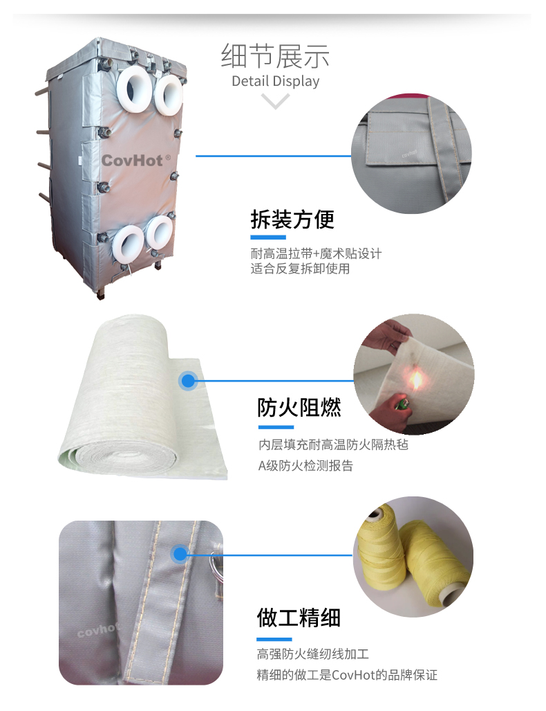 針對以上的問題,科好特自主研發(fā)的節(jié)能型板換保溫套,根據(jù)設(shè)備不同的尺寸形狀量身定制,可有效減少換熱器的熱損失,裝拆方便,可重復(fù)使用。節(jié)能型板換保溫套是工業(yè)節(jié)能保溫理想選擇!
